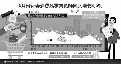 5月份,社會消費品零售總額增長8.5%,比4月份回落0.9個百分點,為什麽5月份社會消費品零售總額增速比4月份回落?毛盛勇分析主要有兩個原因,第一個原因是假日移動效應,去年端午節的假期是在5月份,今年的端午假期是在6月份,經過測算,三天的假日消費就影響了社會消費品零售總額回落1個百分點以上,這是假日的錯月效應帶來的影響。第二個原因是延期消費效應,最近國務院公布了7月1日開始起對汽車還有部分日用品降低關稅,不少消費者減少當期消費。這些影響加在一起造成了5月當月社會消費品零售總額增速有所回落,但是連續起來看還是比較平穩、比較快的。這些因素都是短期因素,下一步,社會消費品零售總額有條件繼續保持平穩較快增長。