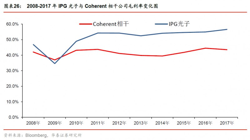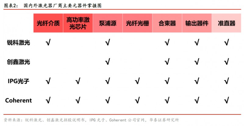 國內(nei) 廠商已掌握大部分器件製造技術,但光纖介質、高功率激光芯片和光纖光柵核心元器件仍依賴進口,除此之外的核心元器件技術已被掌握,而國外激光器龍頭IPG光子、Coherent依靠全產(chan) 業(ye) 鏈整合實現產(chan) 品低成本和性能高穩定性。目前國內(nei) 廠商毛利率水平較高,核心元器件若進一步國產(chan) 化有望為(wei) 國內(nei) 廠商業(ye) 績提供充足支撐。
