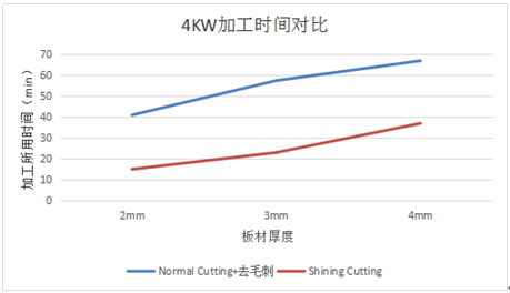 如:4KW激光器安裝“亮切模塊Shining Cutting Device”前後加工同一批鋁板單張板材(3000*1500)所用時間對比: