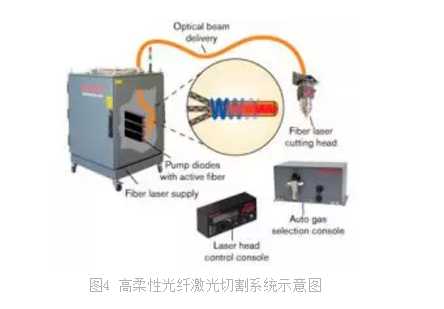 傳(chuan) 統CO2激光切割機的光路完全依靠反射鏡傳(chuan) 播,體(ti) 積較大,占用場地大,對機架和導軌要求極高,難以實現大幅麵和多維切割。圖4為(wei) 高柔性光纖激光切割係統示意圖,光纖激光通過光纖傳(chuan) 輸至激光頭,無需調整光路,使機械係統的設計變得非常簡單,切割係統更加緊湊。