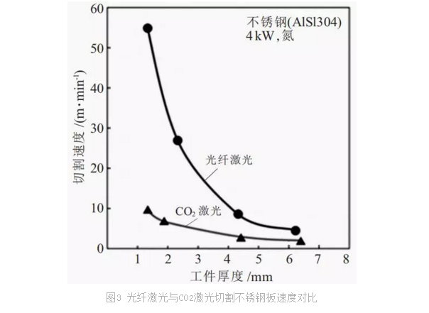 高光束質量、高功率密度使光纖激光切割效率更高,可快速切割較薄材料以及更加有效地切割中等厚度材料。圖3為(wei) 光纖激光與(yu) CO2激光切割不鏽鋼薄板的速度對比,可以看出,薄板的光纖激光切割速度可達到同等功率CO2激光切割的2~3倍。IPG 2kW光纖激光切割係統切割0.5 mm碳鋼的速度可達40 m/min。切割6 mm厚的材料時,1.5kW光纖激光切割係統的切割速度相當於(yu) 3kW CO2激光切割係統的切割速度。光纖激光切割的高速度、高效率已得到大量研究報道的證實。