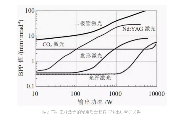 圖2為(wei) 不同工業(ye) 激光的光束質量參數(BPP)與(yu) 輸出功率的關(guan) 係,BPP 值越小表明光束質量越好。與(yu) 其它激光相比,光纖激光具有更好的光束質量(隻在5~10kW範圍略遜於(yu) CO2激光)。光纖激光的低BPP值,使其在高亮度、細焦斑、長焦深、長焦距下能遠距離工作,增強了其在材料加工中的適用性,提高了切割精度。同時光纖激光器在高輸出功率時也能傳(chuan) 輸高質量光束,使它也能適用於(yu) 由CO2激光所主導的厚板金屬切割。