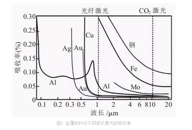 光纖激光的波長為(wei) 1070 nm,是CO2激光波長的1/10。圖1為(wei) 金屬材料對不同波長激光的吸收率。可以看出,短波長的光纖激光更容易被金屬材料吸收。例如低碳鋼對CO2激光的吸收率不足10%,而對光纖激光的吸收率高達35%。這也使得光纖激光能夠切割如鋁、銅等高反射性材料。