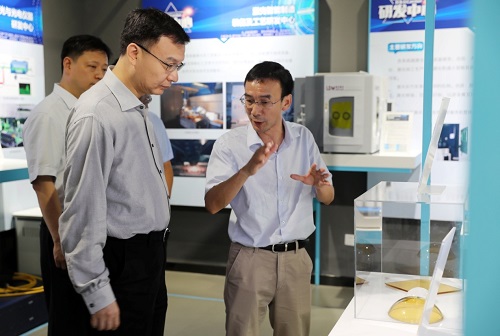 周波一行首先參觀了上海先進激光技術創新中心展示廳,聽取了創新中心的運營模式及最新科研成果轉化情況匯報。隨後,楊上陸研究員介紹了激光技術在新能源汽車中的應用,以及新能源汽車激光加工工藝研發平台的建設進展;賀岩研究員介紹了激光雷達事業(ye) 部產(chan) 品研發及市場應用情況;黃惠傑研究員介紹了高端光刻機照明係統研發及產(chan) 業(ye) 化推進情況。最後,李儒新就當前極紫外(EUV)光刻發展態勢等作了介紹,並就EUV光刻光源裝備研發、產(chan) 研深度融合、協同攻關(guan) 機製等提出建議。