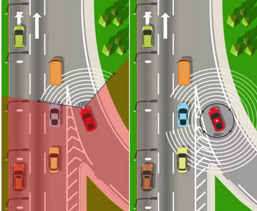 相比之下,如果自動駕駛車輛采用有限水平視野的傳感器,則需要更多的傳感器,並且車輛的計算機係統必須隨後將這些各種傳感器收集的數據拚接在一起。