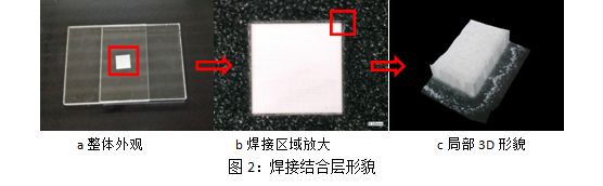采用特種激光進行玻璃焊接試驗,整個(ge) 焊接麵區域內(nei) (4×4mm)焊接成型均勻一致,焊後材料變形小,材料平麵度未發生較大的改變,焊接融合區位於(yu) 兩(liang) 片材料交界麵處厚度較小,融合區域兩(liang) 側(ce) 玻璃均觀察不出熱損傷(shang) 現象。