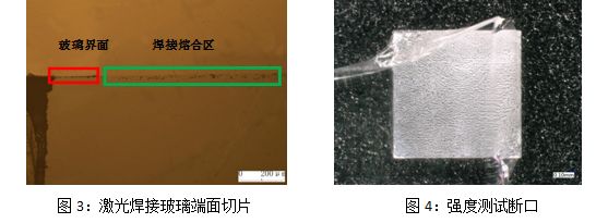 焊後玻璃端麵切片圖顯示,采用新型激光焊接工藝進行焊接時,焊接融合區域並未呈現水滴狀,沒有出現頂部圓形空腔和底部線形結構微小空腔等焊接裂紋源缺陷,其中部熔融區域也未出現斷續未焊接成型的線形裂紋缺陷。進行焊接強度測試,材料在母材區域發生破裂,焊點未有脫落,焊縫具有較好的焊接強度。