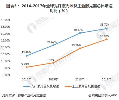 對比工業(ye) 激光器行業(ye) 總體(ti) ,近年來全球光纖激光器的行業(ye) 增速總體(ti) 和工業(ye) 激光器保持了較為(wei) 一致的增長趨勢,但增速明顯高於(yu) 工業(ye) 激光器,可以看出光纖激光器的發展態勢要優(you) 於(yu) 工業(ye) 激光器行業(ye) 總體(ti) 。2016-2017年全球光纖激光器的市場增速均在30%以上。