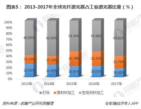 從(cong) 目前全球光纖激光器的市場應用格局來看,宏觀材料加工(切割、焊接等)目前是其主要的需求領域,近年來的應用比重均在60%左右,2017年為(wei) 62.22%;打標和為(wei) 材料加工在2017年的占比分別為(wei) 16%和21.79%。
