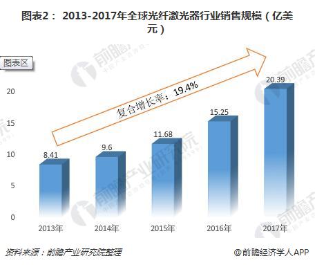 根據前瞻產(chan) 業(ye) 研究院發布的《2018-2023年fun88官网平台產(chan) 業(ye) 市場前瞻與(yu) 投資戰略規劃分析報告》,2017年全球光纖激光器的市場銷售規模突破20億(yi) 美元,達到20.39億(yi) 美元,2013-2017年的複合增長率接近20%。