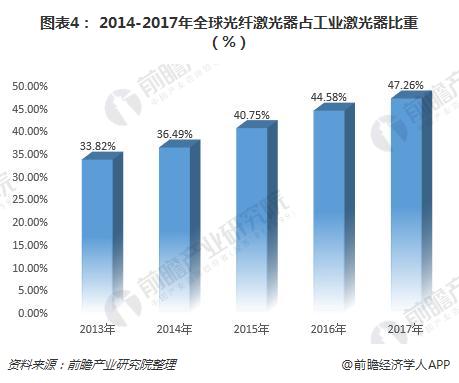 另外,從(cong) 光纖激光器在工業(ye) 激光器行業(ye) 中的占比來看,光纖激光器在工業(ye) 激光器行業(ye) 中的比重逐年上升,從(cong) 2013年的33.82%提升至2017年的47.26%。