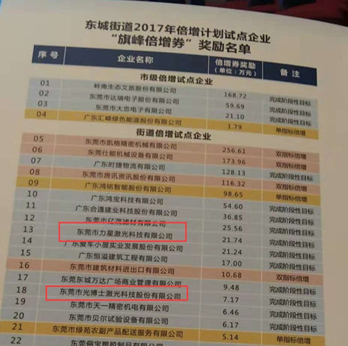 11月20日,東(dong) 莞市東(dong) 城街道舉(ju) 行2017年倍增計劃試點企業(ye) 表彰獎勵會(hui) 議。據獲悉,東(dong) 莞市力星激光、光博士激光入選名單,分別獲得21.7