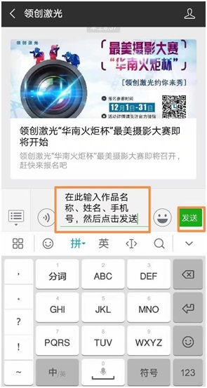 在微信平台對話界麵直接上傳(chuan) 作品信息(參賽圖片、作品名稱、參賽人姓名、聯係電話),如圖: