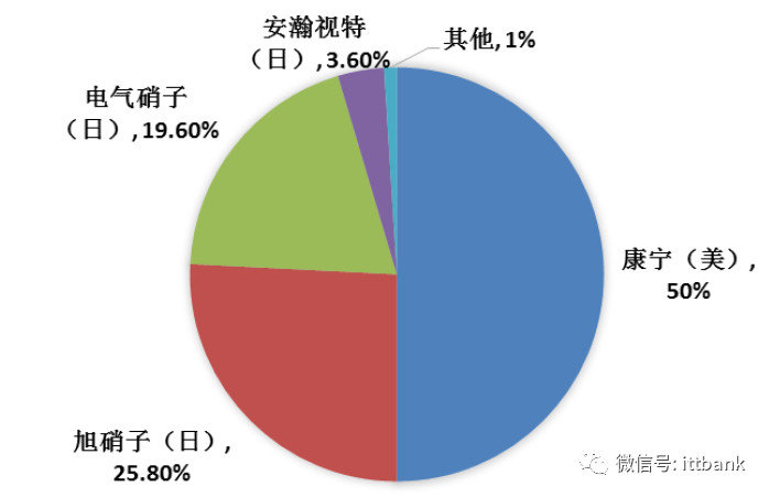 全球近200億(yi) 美元的利潤主要被四家廠商瓜分,康寧(包括三星康寧合資公司)約占了全球市場的一半,日本的旭硝子、電氣硝子分別占據了25.8%、19.6%的份額,安翰視特占3.6%。
