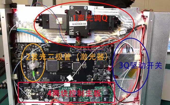 激光器的模塊包含了發光二極管、聲光調Q、Q開光、PCB電路板、風扇、散熱模塊、光纖、溫度反饋控製測量模塊、擴束模塊、傳(chuan) 輸光纖等等,這裏隻是作為(wei) 滿足大家的好奇心,不做任何技術探討。另外需要聲明此激光器的拆卸隻是網絡流傳(chuan) 中的某一家激光器維修記錄,元祿光電不擔負拆卸他人激光器的責任。