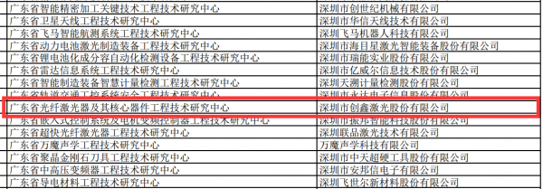 由廣東(dong) 省科學技術廳組織認定的“2018年廣東(dong) 省工程技術研究中心”於(yu) 近期公示了入圍名單,創鑫激光位列其中,被評為(wei) “廣東(dong) 省光纖激光器及核心器件工程技術研究中心”。