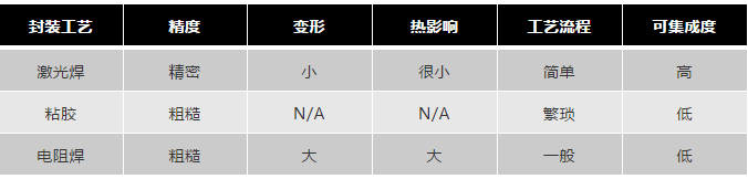 1)激光焊接:在OSA產品中的激光焊接應用最為典型的,也已經成為行業的標準流程。相比較於粘膠和電阻焊工藝,激光焊接技術的優勢是毋庸置疑的