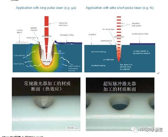 加工的“無熱影響”:脈衝持續時間大於10ps的傳統激光,與材料作用時,熱過程將起到主要作用。脈衝持續時間小於10ps的超快激光,由於脈衝持續時間隻有皮秒、飛秒量級,遠小於材料中受激電子通過轉移轉化等形式的能量釋放時間,能量來不及釋放該脈衝已經結束,避免了能量的轉移,轉化以及熱量的存在和熱擴散,實現了真正意義上的激光“冷”加工