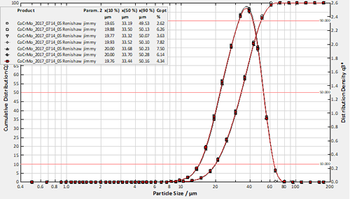 張峻銘博士解釋道:“國研院儀科中心有著專業的驗證能力,我們會對使用的各種材料和設備先進行測試。測試數據結果顯示,雷尼紹金屬粉末質量與穩定性優於其他同類產品(如下圖鈷鉻合金粉末粒徑分布曲線圖所示),無論是在機械性質,還是在精度等方麵都擁有穩定的再現性。”