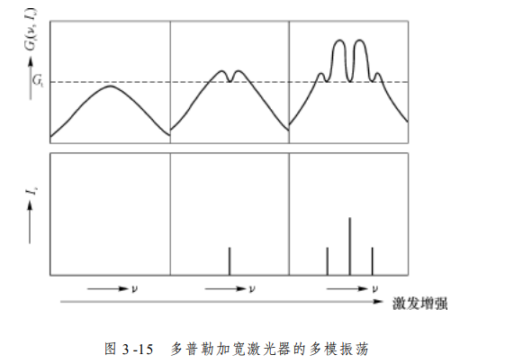 對非均勻加寬激光器,不同頻率的光場在增益曲線不同的位置形成頻率燒孔, 不同模式之間不會(hui) 產(chan) 生競爭(zheng) 現象。因此, 隻要滿足振蕩條件, 不同縱模都可以同時振蕩。定義(yi) 振蕩線寬ΔνT (如圖 3 -15 所示)