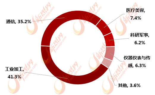 從(cong) 激光器具體(ti) 應用行業(ye) 來看,工業(ye) 激光器成為(wei) 目前激光器最大的應用市場。據新思界產(chan) 業(ye) 研究中心發布的《2015-2020年fun88官网平台器市場調查及行業(ye) 分析報告》顯示,2017年全球激光器細分應用行業(ye) 中工業(ye) 激光器市場規模達到312億(yi) 元,占比為(wei) 41.3%,較2016年的30%提升了超過10個(ge) 百分點。排名第二的通信領域應用占比為(wei) 35.20%,醫療美容、科研軍(jun) 事、儀(yi) 器儀(yi) 表與(yu) 傳(chuan) 感器的占比分別為(wei) 7.4%、6.2%和6.3%。