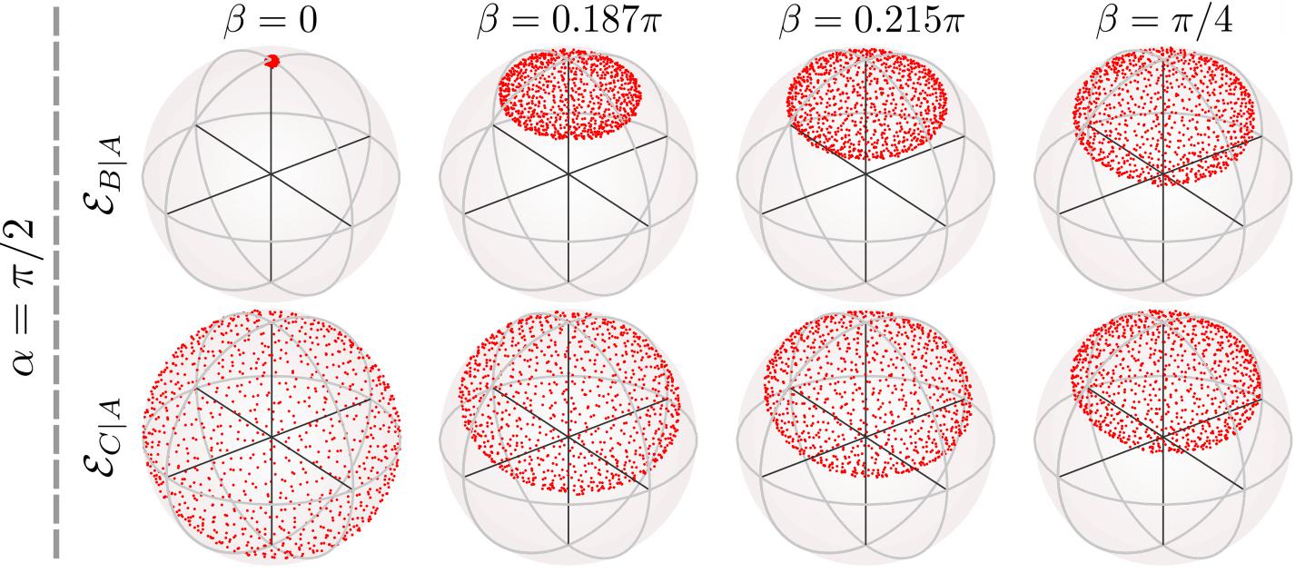 在共享的量子態不理想,或者多方共享量子態的情況下,Alice將不能將Bob的係統導引到任意的量子態上。此時Alice所能導引Bob的量子態的集合在Bloch表示下將構成一個(ge) 橢球。我們(men) 知道單比特量子態可以可視化地表示為(wei) Bloch球中的一個(ge) 矢量,而量子導引橢球則為(wei) 兩(liang) 比特量子態提供了一個(ge) 簡單的可視化表示方法。在多方共享量子態的情況下,量子導引橢球具有體(ti) 積單配性。例如Alice, Bob和Charlie共享一個(ge) 三比特糾纏純態,則Alice導引Bob和Alice導引Charlie的橢球體(ti) 積存在一個(ge) 簡潔的單配關(guan) 係,即改變參數使一個(ge) 導引橢球的體(ti) 積變大時,另一個(ge) 導引橢球的體(ti) 積則會(hui) 變小。