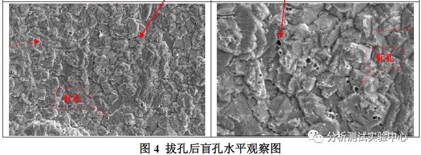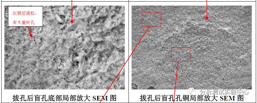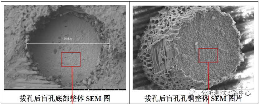 將盲孔中的孔銅直接拉拔出來,使用掃描電鏡觀察盲孔底部和孔銅底部的情況,分析結果如下圖4所示: