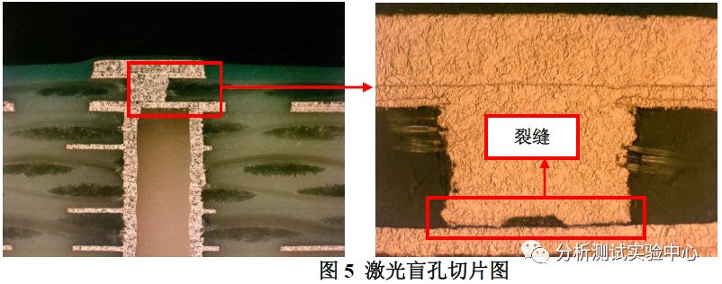 對激光盲孔位置進行切片分析,分析結果如圖5所示,可見盲孔底部存在裂縫。