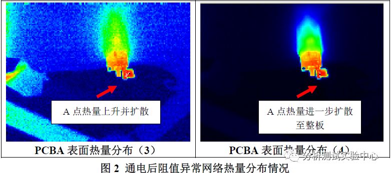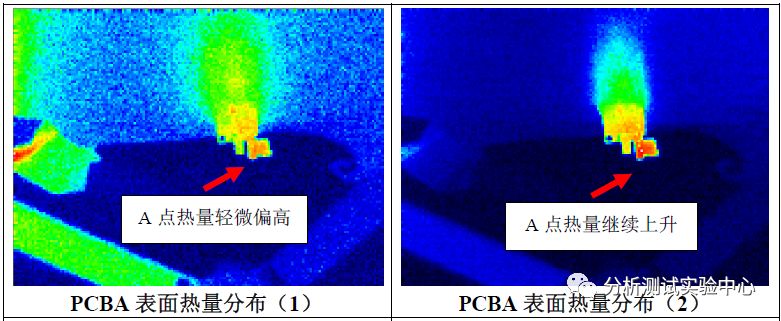 從(cong) 上圖2中可知,隨著恒電流通電時間越長,故障網絡上焊接點A處發熱量最大,表觀溫度最高,而且隨通電時間延長,熱量逐漸上升,並擴散至全板,說明A點處阻值偏大,且有可能是導致故障網絡電阻值不穩定的主要原因。