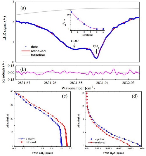 紅外激光外差光譜技術具有光譜分辨率和垂直空間分辨率高、采樣速度快、體(ti) 積小、功耗低、散粒噪聲極限探測靈敏度等優(you) 點,在大氣衛星遙感探測、天文觀測等領域具有重要的應用前景。課題組談圖副研究員、王貴師副研究員等人以3.53 μm帶間級聯激光器作為(wei) 本振光源,建立了0.003cm-1光譜分辨率的大氣甲烷及水汽地基被動激光外差探測係統,獲得了高光譜分辨率的光譜數據,並基於(yu) OEM(最優(you) 估計算法)及RFM(參考正向模型)建立了大氣溫室氣體(ti) 廓線反演模型,利用測量數據獲得了大氣甲烷和水汽的垂直廓線,以及甲烷氣體(ti) 柱總量及幹空氣混合比。