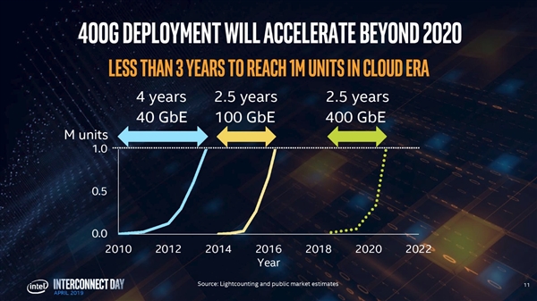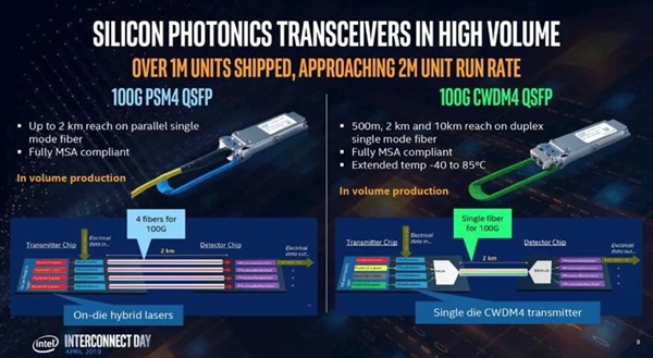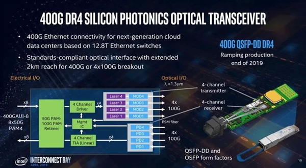 Intel計劃今年第四季度量產400G矽光子收發器,而在過去兩年,Intel已經賣出了100多萬個100G收發器。