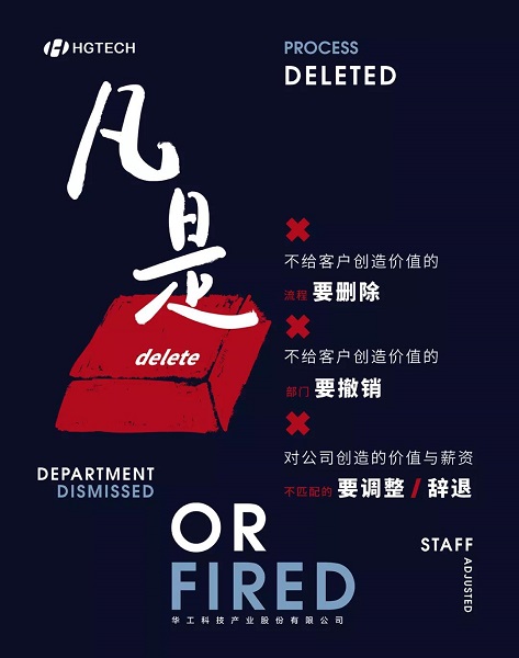 對於企業來說,我們所從事的一切活動——研發、生產、管理所產生的費用甚至日常辦公費、水電費都是客戶買的單,沒有以客戶為中心,內部再熱鬧、再多亮點,也是自娛自樂。2017年,我再次擔任總裁後,進一步明確了“以市場為導向,以客戶為中心”的理念,在此基礎上進一步提出:凡是不給客戶創造價值的流程要刪除,凡是不給客戶創造價值的部門要撤銷,凡是不給客戶創造價值的員工要辭退,在內部簡稱為“三個凡是”,今年根據實際情況又將“凡是不給客戶創造價值的員工要辭退”調整為“凡是創造的價值與薪資不匹配的要調整或辭退”。
