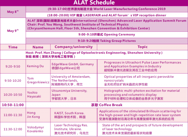 ALAT 2019國際(深圳)前瞻激光技術大會(hui) 今年是第三次舉(ju) 辦,作為(wei) ALAT亞(ya) 洲激光論壇第一子論壇,旨在打造激光與(yu) 光子學技術科研領域具有國際性一流水平的會(hui) 議活動。目前已確定邀請到來自德國、荷蘭(lan) 、日本、韓國、美國、烏(wu) 克蘭(lan) 、澳大利亞(ya) 、中國等多個(ge) 國家知名專(zhuan) 家參會(hui) 並作技術報告。