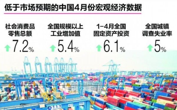 近日,中國相關(guan) 統計部門公布了4月宏觀經濟數據,結果顯示全麵遜於(yu) 預期,其中消費增速更創下近16年新低。 4月社會(hui) 消費品零售總額按年增長7.2%,創近16年新低,規模以上的工業(ye) 增加值按年增長5.4%。兩(liang) 項指標均大幅低於(yu) 市場預期。投資方麵,今年首四個(ge) 月固定資產(chan) 投資按年增長6.1%,較首三個(ge) 月回落0.2個(ge) 百分點,同樣遜於(yu) 市場預期。分析指出,鑒於(yu) 中美貿易摩擦升級加劇外部不確定性,中國第二季度經濟恐將麵臨(lin) 較大的下行風險。