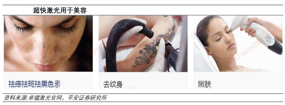 醫療美容:超快激光一般用於眼科醫療手術設備和美容儀器。飛秒激光被用於近視手術,近視患者的眼軸大於正常眼軸,使得在眼球調節鬆弛狀態下,光線進入眼球後屈光係統折射的焦點落在視網膜之前。飛秒激光手術除去眼軸維度上多餘的肌肉,使光線落點的距離恢複正常。飛秒激光手術準確、安全、穩定、手術時間短、舒適性高等優點,已經成為當前最主流的近視手術治療手段之一。在美容方麵,超快激光可用於去除色素和原生痣、去除紋身等,也可以用來改善肌膚的衰老情況,其應用“光子嫩膚”在市場上極受女性青睞。