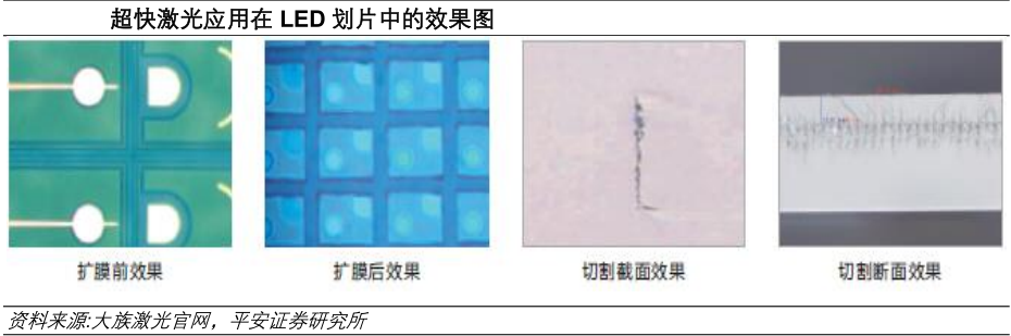 - 顯示照明:超快激光在顯示照明領域的應用主要是指LED晶片的劃線和切割,這也是超快激光適合硬脆材料加工的又一例證,超快激光加工的截麵平整度高,崩邊顯著減少,效率和精度都大大提升。