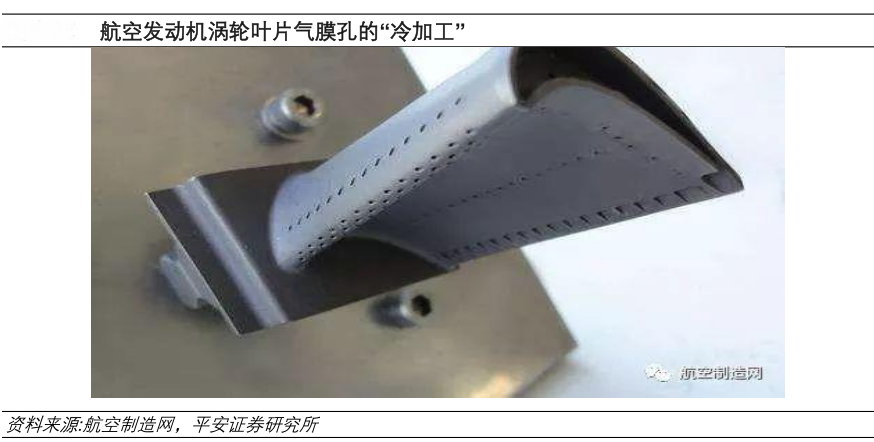 - 航空航天:為提高渦輪葉片的性能和使用壽命,進而提高發動機的性能,需要采用氣膜冷卻技術,這對氣膜孔加工技術提出了極高的要求,2018 年西安光機所開發出國內最高單脈衝能量的26瓦工業級飛秒光纖激光器,並研製出係列化超快激光極端製造裝備,實現了航空發動機渦輪葉片氣膜孔的“冷加工” 突破,填補了國內空白,這種加工方法較電火花加工等方法精度更高,成品率大大提升。