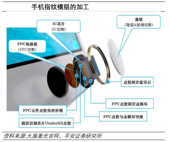 - 消費電子: 超快激光適用於消費電子製造過程中的硬脆透明材料加工、薄膜加工、精密打標等。納秒紫外激光和超快激光是目前切割藍寶石的主要技術手段,超快激光的加工效果比紫外納秒激光更好。藍寶石的硬度高,脆性大,使用傳統的機械加工方式效率和良品率很低,藍寶石現在已經廣泛的應用於智能手表、手機攝像頭蓋板、指紋模組蓋板等,帶給超快激光極大的市場機遇。此外,攝像頭模組、指紋模組使用的加工方式,也以納秒和皮秒激光為主。未來柔性手機屏(可折疊屏)的切割、及對應的3D玻璃鑽孔,超快激光也極大可能地會成為主流解決方案。