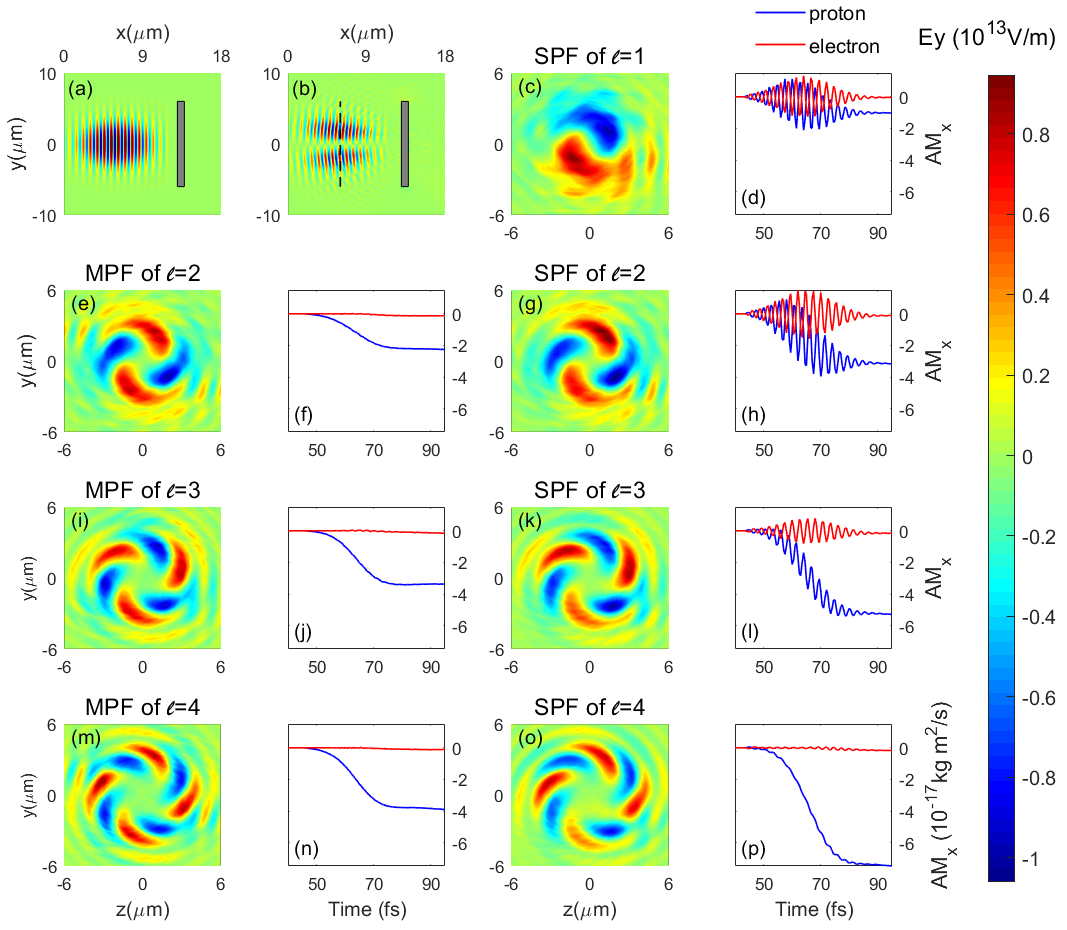 圖2. 用兩個不同係列的等離子體螺旋相位板(SPF和MPF)產生具有不同拓撲荷的渦旋光束和靶內粒子的角動量振蕩效應
