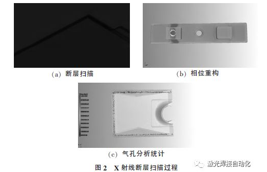 inkMacSystemFont, 'Helvetica Neue', 'PingFang SC', 'Hiragino Sans GB', 'Microsoft YaHei UI', 'Microsoft YaHei', Arial, sans-serif;color:#333333;font-size:16px;font-weight:normal;" align="center"> 激光器由德國IPG 的準連續光纖激光器YLS-450-4500-QCW-AC, 激光波長為(wei) 1 070 nm, 光斑直徑為(wei) 0.2 mm, 光束質量2.2 mm·mrad; 連續模式下,平均功率500 W; 脈衝(chong) 模式下, 單脈衝(chong) 能量45 J,峰值功率4 500 W, 脈寬0.2~50 ms, 頻率1~100 Hz。試驗所用檢測設備為(wei) 德國Phoenix 的v|tome|x s 240,分辨率達微米級。試驗參數為(wei) : 光子能量160 keV, 曝光時間1 s, 樣品與(yu) 探測器探頭間的間距20 cm, 每次掃描斷層照片3 000 張, 空間分辨率25 μm。斷層掃描完後使用VG studio 軟件對斷層照片進行重構與(yu) 分析, 對切片中的氣孔進行標記、分割和三維特征參數測量, 測量參數包括氣孔的等效直徑、球度和體(ti) 積率; 最後對所得到的氣孔形貌特征進行辨識和統計分析。測量步驟如圖2 所示, 為(wei) 了提高測量精度, 截取電池殼體(ti) 的一部分進行測量分析。