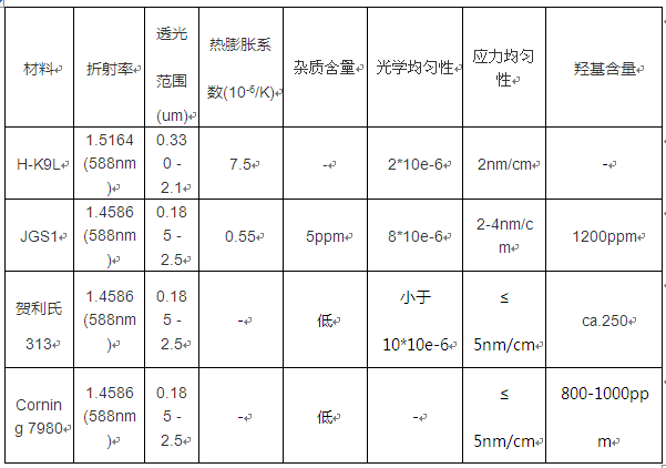 對於(yu) 紫外、YAG光纖和半導體(ti) 激光器等,常用的光學元件材料有H-K9L、紫外熔石英(JGS1)、賀利氏313和康寧7980等。相比較於(yu) K9玻璃,石英玻璃有更低的熱膨脹係數,更少的雜質含量,更好的光學均勻性,因而受到高功率激光市場的青睞。在高功率和超快激光應用領域,國內(nei) 廠家更傾(qing) 向於(yu) 國外的賀利氏和康寧材料。