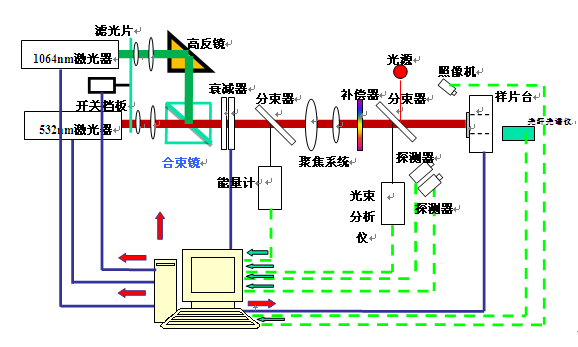該係統具有一下三種特點及優(you) 勢:首先,相互補充、互為(wei) 校對的多種損傷(shang) 判別方法。每種損傷(shang) 判別方法都有一定的局限性和應用範圍,單一的損傷(shang) 判別方法難以對不同厚度、不同膜係的薄膜均做出準確的判別。本套係統集成了多種檢測方法:圖像檢測、散射檢測、光譜檢測、聲譜檢測等,這些方法相互補充、互為(wei) 校對,拓展了測試對象的應用範圍,為(wei) 整體(ti) 係統的測試穩定提供了有力的保障。其次,高倍率的樣品在線檢測複核係統。由於(yu) 工作距的限製,目前測試係統中圖像判別法采用的CCD放大倍率隻能達到50倍以下,不滿足國際標準規定的100倍的要求。對此,係統配備了高倍變焦顯微鏡校驗係統,方便用戶在不影響測試過程,不拆卸樣品的情況下,對損傷(shang) 點的實際情況進行在線複查,保證了對準精度。另外,雙波長共光路的係統設計。本儀(yi) 器具有單波長(1064nm或者532nm)和雙波長(1064nm和532nm)兩(liang) 種類型。針對雙波長測試儀(yi) ,采用兩(liang) 台激光器,經過合色棱鏡,合並在一束光路上,簡化了光學係統結構,可對同一點,實現雙波長激光的同時預處理。