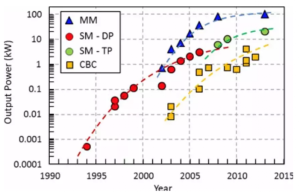 inkMacSystemFont, "font-size:16px;text-align:justify;background-color:#FFFFFF;"> 激光技術以其良好的遠距傳(chuan) 輸特性和高能量密度,早在80年代就以化學激光器為(wei) 代表進入軍(jun) 工領域。但是化學激光器的低輸出穩定性和低光電轉換效率帶來的高能耗、龐大的體(ti) 積和重量,使得激光武器長期隻能夠以大型波音飛機為(wei) 載體(ti) ,而且實用化進展緩慢。光纖激光器在20世紀90年代開始的高速發展,以及光纖激光器天然的高電光轉換效率和單模態輸出能力,贏得了軍(jun) 工領域的重點關(guan) 注,帶來了在以大模場摻鐿光纖、高亮度976nm泵浦二極體(ti) 、高功率單模光纖激光器等方向為(wei) 代表的光纖激光器技術上的大規模研發投入。軍(jun) 工方麵的大規模投入也推動光纖激光器技術升級的高速發展,如下圖所示,單模光纖激光器的輸出功率從(cong) 1994年公開報道的不到1W到2013年的超過10kW輸出功率。