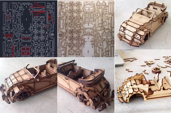 由於(yu) 木質材料對激光具有良好的吸收性能,近年來激光技術被廣泛用於(yu) 木質材料加工。先將立體(ti) 圖像拆分的各部分零件通過軟件製圖,利用激光在平麵木板材料上完成圖像的切割,再手工拚接成立體(ti) 實物模型。既考驗動手能力也考驗創意能力。