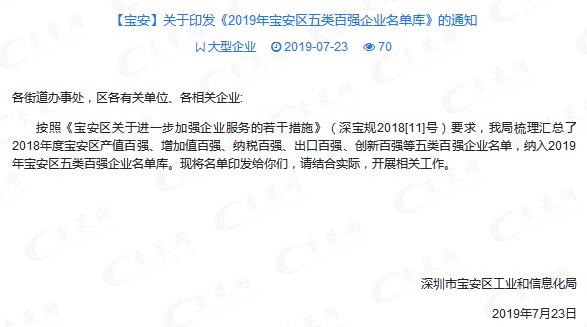 7月23日,深圳市寶安區工業(ye) 和信息化局印發2019年寶安區五類百強企業(ye) 名單庫,包括產(chan) 值百強、增加值百強、納稅百強、出口百強、創