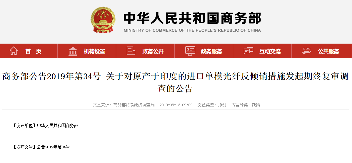 2019年6月3日,商務部收到長飛光纖光纜股份有限公司、江蘇亨通光纖科技有限公司、烽火藤倉(cang) 光纖科技有限公司、中天科技光纖有限公司、杭州富通通信技術股份有限公司、江蘇法爾勝光子有限公司和成都中住光纖有限公司代表中國單模光纖產(chan) 業(ye) 提交的反傾(qing) 銷措施期終複審申請書(shu) 。申請人主張,如果終止反傾(qing) 銷措施,原產(chan) 於(yu) 印度的進口單模光纖的傾(qing) 銷可能繼續或再度發生,對中國產(chan) 業(ye) 造成的損害可能繼續或再度發生,請求商務部裁定維持對原產(chan) 於(yu) 印度的進口單模光纖實施的反傾(qing) 銷措施。