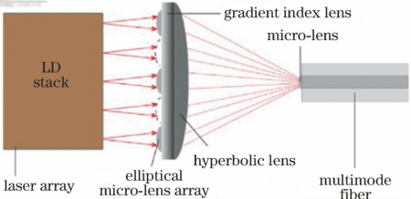 2011年,賈文武等將MLA用於(yu) LD疊陣整形,由於(yu) MLA破壞了LD疊陣中各子光束之間光場分布的相似性,且保證分割後的光束以非相幹形式疊加,最終實現了勻化的目的。2014年,Qiao等利用橢圓MLA、GRIN及聚焦透鏡組成的光學係統對LD疊陣光束進行了準直與(yu) 聚焦,並將其耦合入光纖,如圖3所示。
