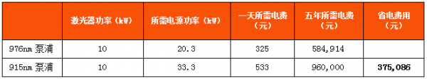 inkMacSystemFont, "font-size:16px;text-align:justify;background-color:#FFFFFF;"> 摻鐿光纖在976nm的吸收率是915nm泵浦波長的3倍以上,976nm泵浦技術方案的單模高功率相比915nm泵浦技術路線,可以實現3-5kW的單模組高功率激光器,3000W以內(nei) 可現實M2<1.2,同功率單模產(chan) 品可實現的光束質量更高。同時,相比於(yu) 國內(nei) 的915nm泵浦路線的25-30%光電轉化效率,976nm泵浦技術路線光電轉化效率超過42%,在6kW以上的超高功率激光器節能省電特點及帶來的經濟性被充分認識並且是各大激光設備商一直追逐的方向。如下表所示,10kW的將會(hui) 省電近40萬(wan) 元,這將會(hui) 給終端客戶帶來巨大的經濟效用。