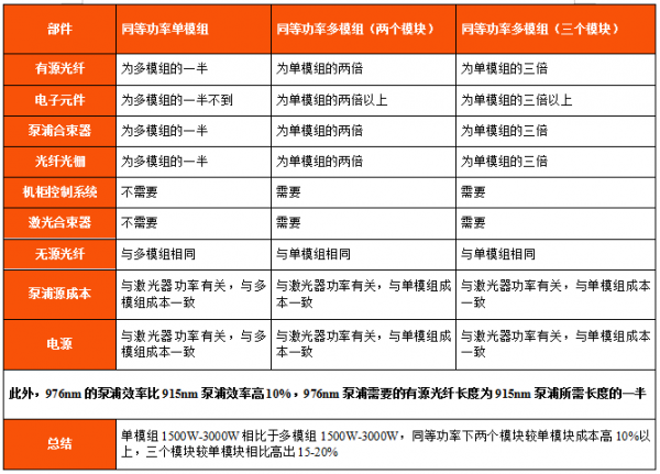 inkMacSystemFont, "font-size:16px;text-align:justify;background-color:#FFFFFF;text-indent:32px;"> 976nm單模塊相比於(yu) 同功率915多模塊大大減少原材料使用。976nm泵浦技術路線可實現單模單腔3000W,元器件的成本降低較多,相比如多模塊的元器件使用對比如下: