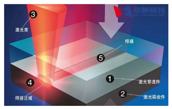 inkMacSystemFont, " font-size:16px;text-align:justify;background-color:#ffffff;"=""> 激光焊接是利用高能量密度的激光束作為(wei) 熱源的一種焊接方法,即激光輻射加熱工件表麵,表麵熱量通過熱傳(chuan) 導向內(nei) 部擴散,使工件熔化,形成特定的熔池。如下圖所示,激光束通過上層透光材料,然後被下層材料吸收,激光能量被吸收後轉換為(wei) 熱能,由於(yu) 兩(liang) 層材料被壓在一起,熱能從(cong) 吸收層傳(chuan) 導到透光層上,使得兩(liang) 層材料熔化並結合。